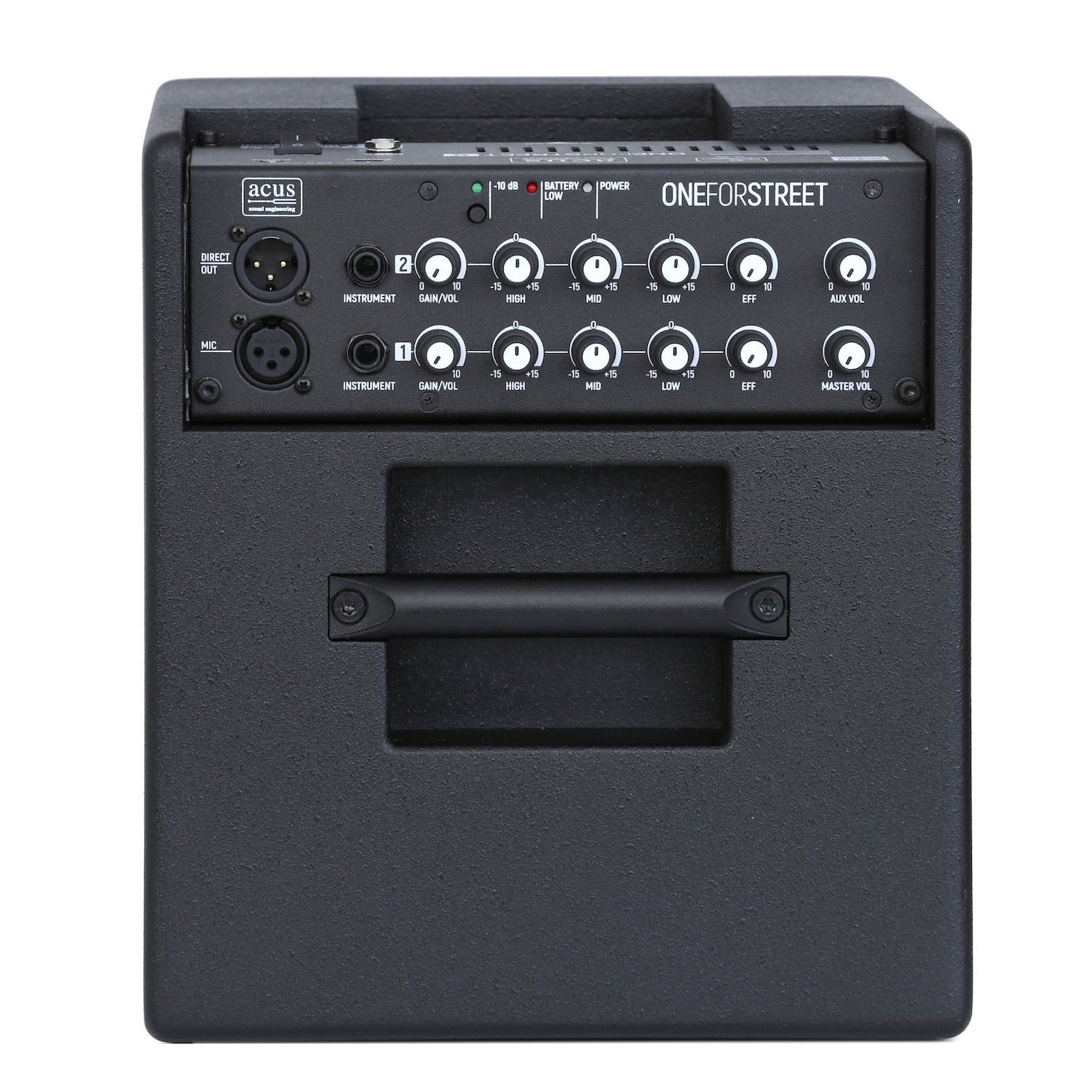 - Eingänge: 6,3 mm Klinke + XLR (Kanal 1), 6,3 mm Klinke (Kanal 2), 3,5 mm Klinke (Aux-In)