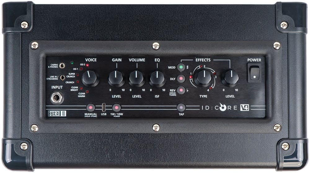 Die ID:Core V4 Verstärker sind mit 10W, 20W oder 40W Leistung erhältlich und aufgrund ihrer leichten Bauweise und integrierten Effekte sowohl für Anfänger als auch Profis geeignet. Der ID:Core 40 V4 bietet die gewohnt intuitiven Bedienelemente eines traditionellen Verstärkers, ist aufgrund seiner Programmierbarkeit aber deutlich vielseitiger. Über den Voice Regler lassen sich sechs verschiedene Sounds Clean Warm, Clean Bright, Crunch, Super Crunch, OD 1 und OD 2 aufrufen. In Kombination mit dem ISF Regler können diverse Sound von amerikanisch bis britisch und dazwischen eingestellt werden. Die Effektsektion des Amps erzeugt breite Stereo-Modulations, Delay- und Reverb-Effekte in Studio-Qualität. Mit der mitgelieferten Architect Software lassen sich über USB-C weitere Einstellungen vornehmen und abspeichern. Der Line In / Streaming Eingang ermöglicht, neben dem Abspielen von Musik, mithilfe eines 3,5mm Kabels das Streamen direkt über ein Smartphone.