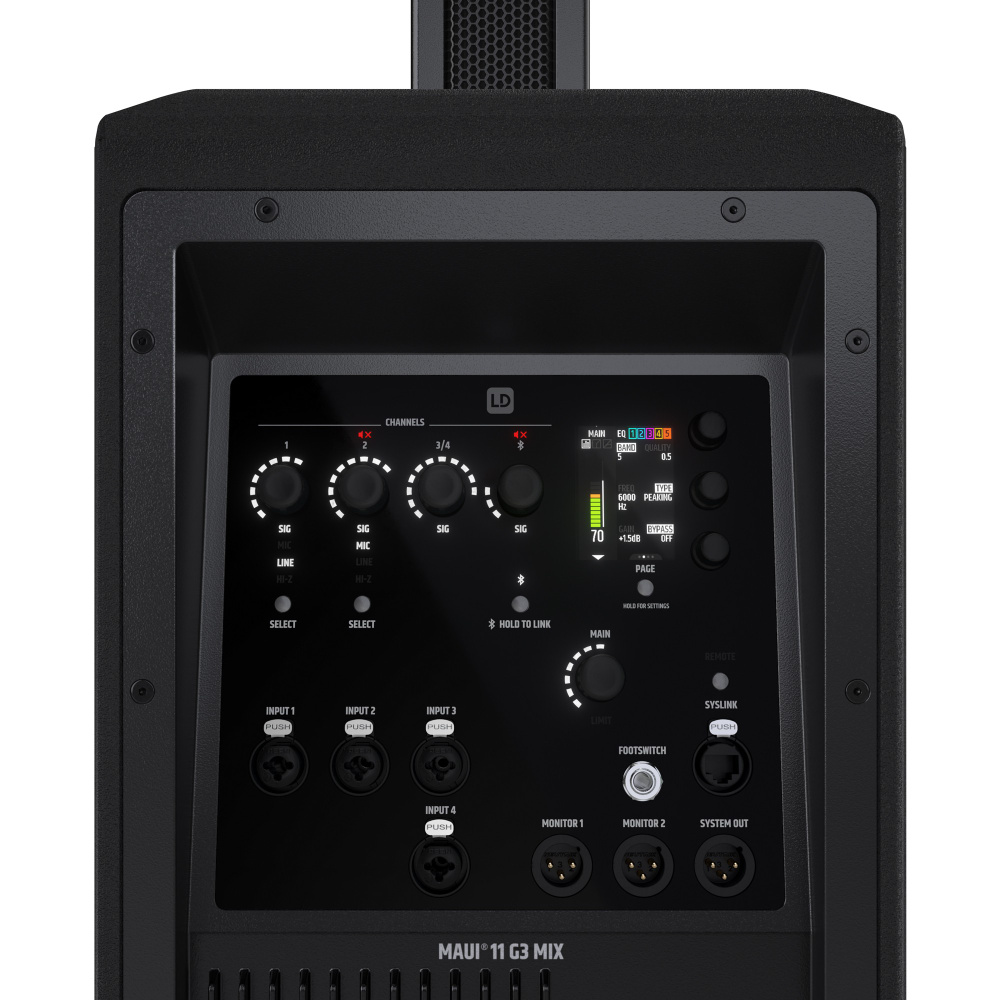 Kompakt, kraftvoll und unkompliziert - eine Säulen-PA ist und bleibt der ideale Partner für DJs und kleine Bands. Die MAUI-Serie von LD Systems verkörpert das All-In-One-Konzept in Reinform und bietet ein unschlagbares PA-Paket aus Sound, Design, Technik und Handling. Aufbauen, anschließen, fertig! Das gilt besonders für die MAUI G3 MIX-Versionen mit integriertem digitalem 6-Kanal-Mischpult. Alle Komponenten sind mit an Bord und perfekt aufeinander abgestimmt: Mischpult, Effekte, Dynamikbearbeitung, DSP- Controller, Endstufen und Lautsprecher. Auch die drahtlose Fernsteuerung über Smartphone oder Tablet mit Hilfe der kostenlosen MAUI-App (iOS oder Android) ist inklusive. Die MAUI 11 G3 MIX ist ein besonders kompaktes, außergewöhnlich leistungsstarkes und smartes Säulen-PA-System der Premium-Klasse. Sie liefert einen großen, druckvollen und präzisen Sound mit 730 W RMS-Leistung (1.460 W Peak), der in allen Anwendungen überzeugt: als Main-PA für Singer/Songwriter und kleine Bands, als Soundsystem für mobile DJ-Plus-Formationen oder als Beschallungsanlage auf Hochzeiten, Firmenfeiern und weiteren Events.