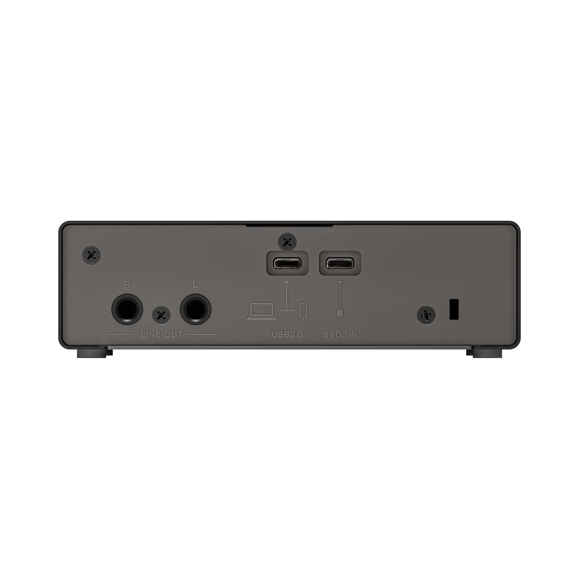 - 2 TRS-Line-Ausgänge, 1 Kopfhörerausgang, der über die Ausgangslautstärke gesteuert wird